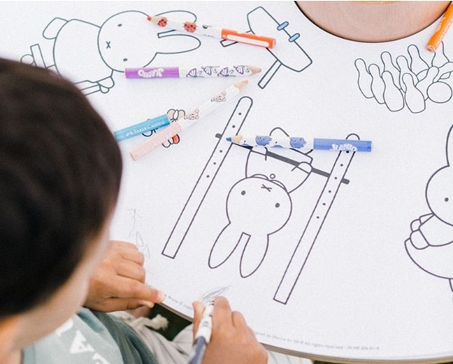 Der Tisch bietet verschiedene Malvorlagen, die auf der Website Drawin'Kids verfügbar sind. Kinder können auf weißen Blättern zeichnen oder Blätter mit Darstellungen von Tieren, Zeichentrickfiguren (Mascha und der Bär, Miffy das Kaninchen) sowie Städten, Pflanzen, Jahreszeiten, Lernspielen usw. ausmalen.