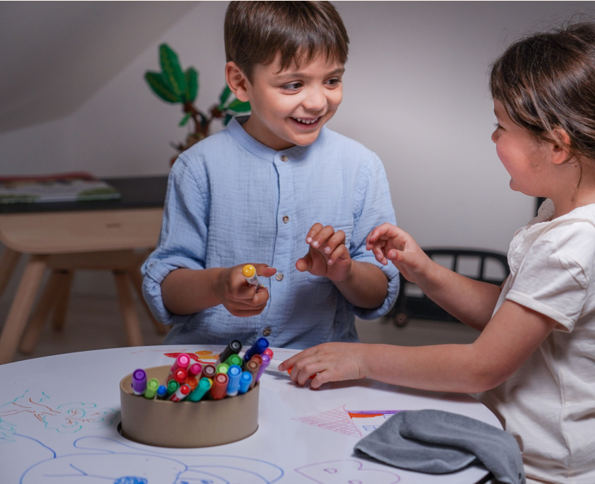 Une belle table mérite de beaux outils. Proposer des feutres de qualité, adaptés aux petites mains et lavables, change tout le plaisir du tracé. Pensez aussi aux solutions de rangement : des pots ou des trousses permettent de garder la surface de la table de coloriage ordonnée et invitante. Un espace bien rangé donne toujours plus envie de créer.