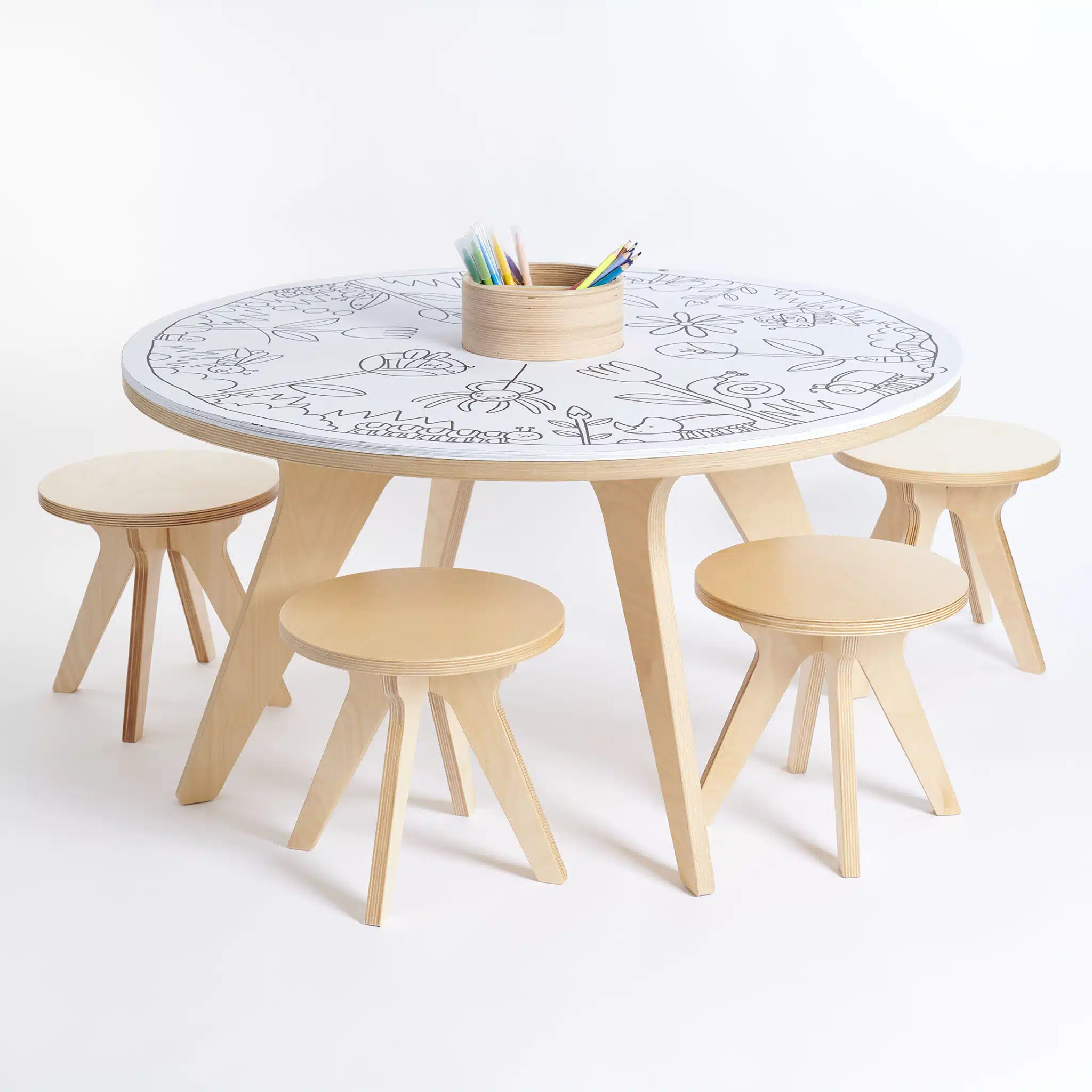 Table à dessin XXL (Ø90 cm) + 4 tabourets en bois. Pour 1 à 6 enfants. Idéale pour créer, jouer, dessiner dans un espace familial ou professionnel.